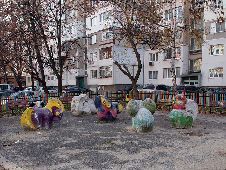 Площадката е разположена между жилищни сгради и е обновена/допълнена с нови съоръжения не много отдавна. Може да се каже, че площадката е скрита зад кварталния магазин. Животните са боядисани в ярки цветове, а в центъра на площадката може да се види още една вариация на слона-пързалка.